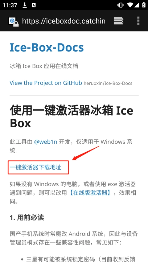 点击该选项后会跳转至浏览器页面,你需要把跳转后的链接复制下来并在电脑上打开,接着点击一键激活器的地址,将冰箱激活器安装到电脑上。