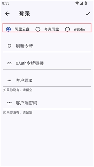 进入登录页面后,可选择阿里云盘、夸克网盘或WebDAV。