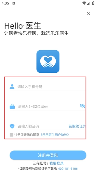 在【Hello·医生】的注册页面,依次填写【手机号码、6到32位的密码以及验证码】,随后点击【注册并登录】按钮,即可完成账号的注册与登录操作。