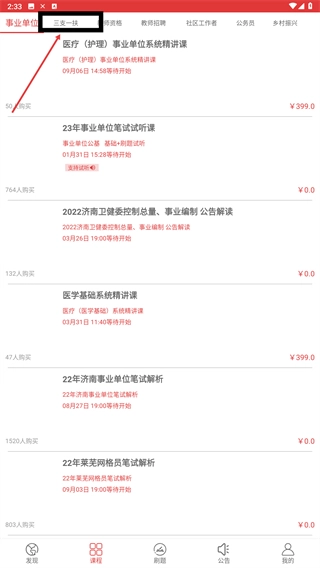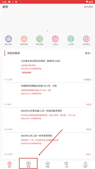 在“发现”页面点击底部的【课程】按钮,就能进入课程分类界面,在里面可以查看事业单位、教师招聘等各类别的课程资源。