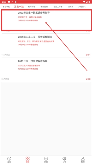在三支一扶的课程列表里,找到你想学习的目标课程(比如《2023年三支一扶笔试备考指导》这门课),点击它就能进入到课程的详情页面了。