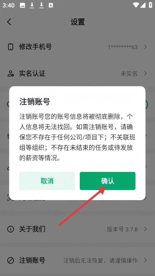在【设置】页面里,当你点击【注销账号】这个选项时,系统会弹出用于确认注销账号的弹窗。