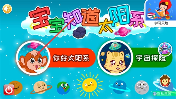 进入【宝宝知道太阳系】界面后,你可以选择【你好太阳系】或者【宇宙探险】这两个模块来开始学习,另外也能通过【学习天地】这个板块获取到更多相关的内容。