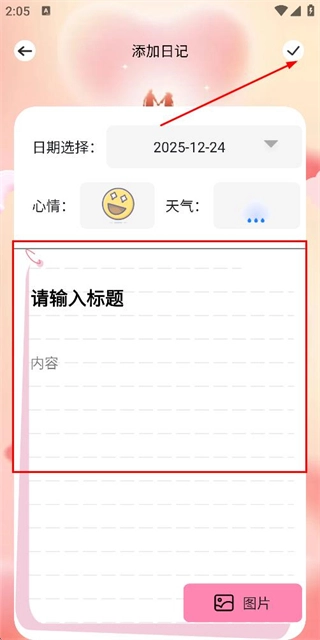 在添加日记的页面填写好标题与内容后,点击右上角的按钮来保存日记。