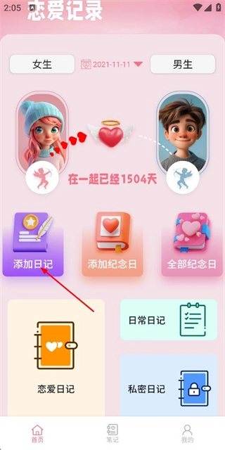 在菜单中选择恋爱日记选项,进入添加日记页面。