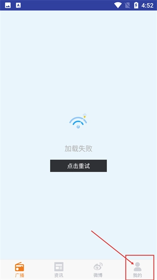 当出现【加载失败】的情况时,你可以选择点击界面上的【点击重试】按钮来重新加载内容,或者先点击底部的【我的】按钮进入个人页面。
