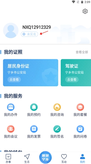 进入智慧宁乡进入个人中心页面,点击“未实名”。