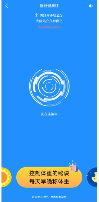 请开启手机蓝牙功能,光脚站到秤面上,待连接成功后,系统将自动启动智能分析流程。