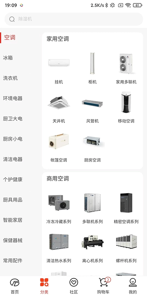 首页:包含空调馆、冰箱馆、洗衣机馆、厨卫大电、厨房小电等十大家庭生活电器品类;