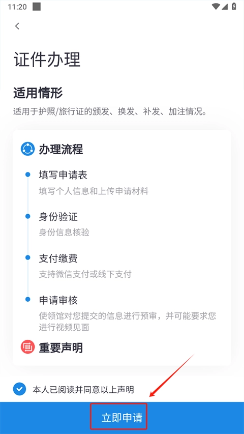 了解办理流程后点击立即申请按键