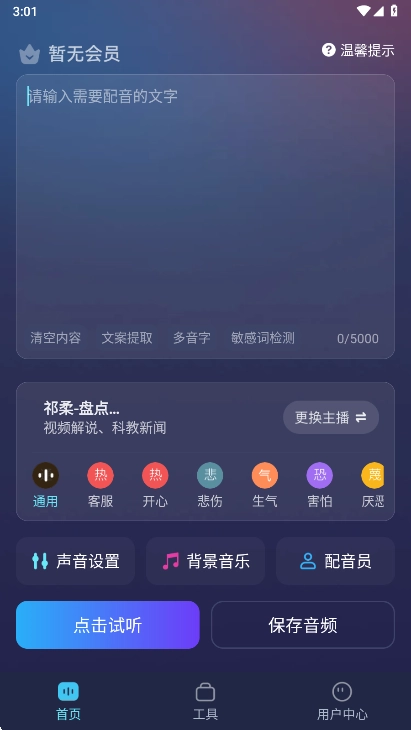 在本站安装掌上配音并打开,进入首页后,您就能浏览到基础的配音功能。