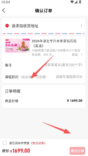 回到刚才的购买页面,填写地址、备注以及课程顾问等相关信息,全部填写好之后点击提交订单,然后通过微信或者支付宝完成支付。