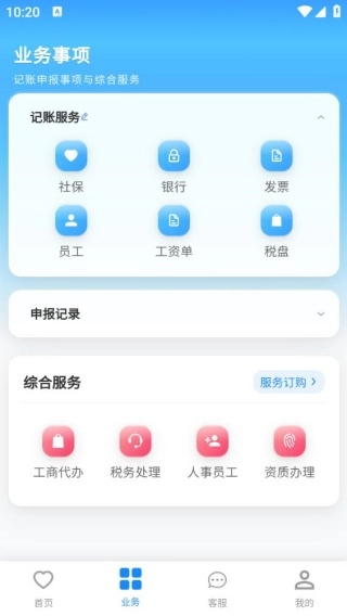 点击业务板块,可使用记账服务、综合服务,以及进行记账申报事项和综合服务的相关操作。