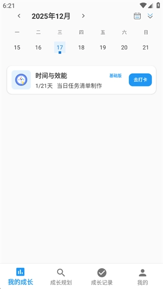 我的成长历程通过详细的日历清晰呈现,用户可以直接高效地进行打卡,尽享便捷体验。