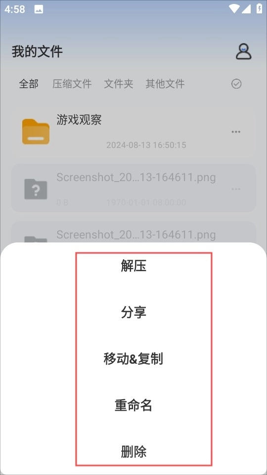 点击“示例文件”后,可使用解压、分享、移动、复制、重命名及删除等功能。
