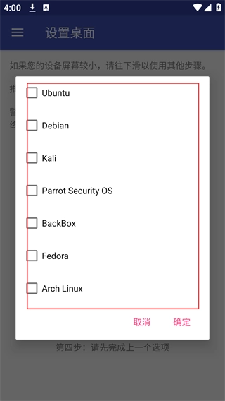 在系统选择列表里,勾选你要的Linux发行版(像Ubuntu、Debian这类),点击“确定”按钮,就能完成桌面环境对应的系统选择操作,接着进行后续的配置步骤。