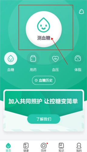 首先用户要在首页点击测血糖的按钮,这样就能启动血糖测试流程了哦!不过要记得先把蓝牙打开才行。