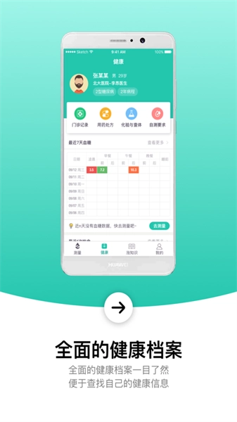 能够不受时间地点限制地测量人体各项数据,只需一键操作就能完成血糖、血压、体重的检测,所有测量数据还会自动进行保存。