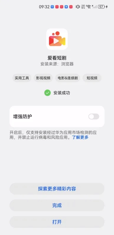 最后,屏幕上出现绿色对勾时,就表示“安装完成”了,此时点击“打开”按钮,就能开始体验。