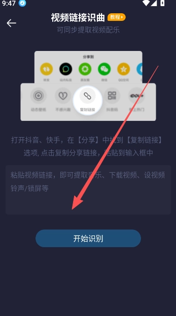 在抖音平台找到需要提取音乐链接的视频,点击该视频后选择开始识别功能,待识别过程结束,即可完成音乐链接的提取操作。