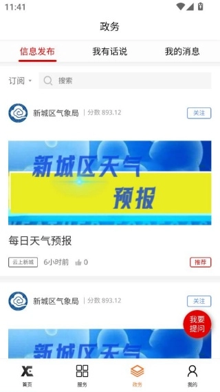政务板块具备信息发布功能,支持查看每日天气预报,用户如有疑问可进行在线咨询。