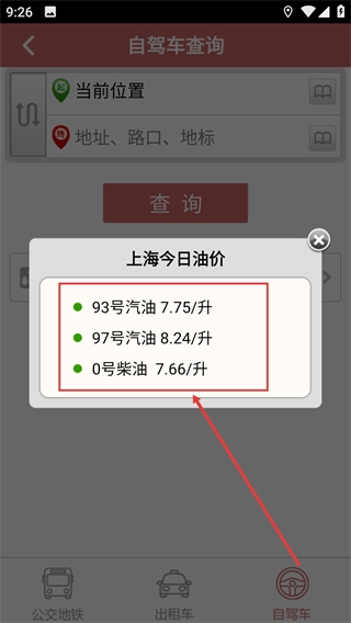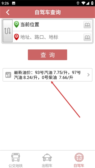 切换到【自驾车】查询页面,【起点】默认显示当前所在位置,填写好【终点】地址后,就能查看【最新油价】相关信息,点击【查询】按钮即可获取自驾路线。