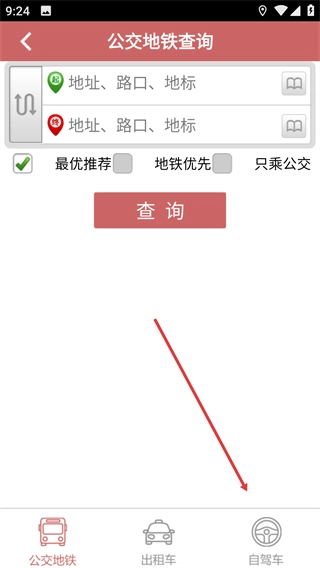 进入【公交地铁查询】页面,填写【起点】至【终点】地址,可选择【最优推荐】等查询方式,点击【查询】按钮即可获取对应的公交地铁路线信息。