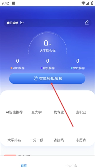 界面会展示【我的成绩】以及适配的大学数量,借助【智能模拟填报】功能即可启动志愿推荐服务,同时也能运用【AI智能推荐】-【查大学】这类辅助工具。