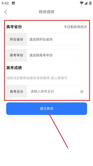 进入【修改成绩】页面时,需要填写【所在省份】、【高考年份】和【高考总分】这三项信息,填写完成后点击【提交修改】按钮,所修改的成绩会对推荐结果的录取概率产生影响。