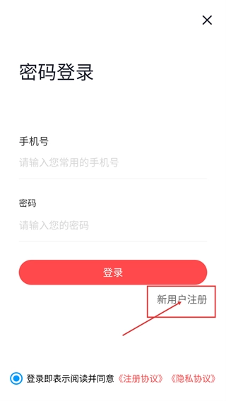 进入密码登录界面后,需填写【手机号码】和【登录密码】以完成登录流程;如果是新用户,请点击页面上的【新用户注册】选项,系统会自动跳转到注册界面。