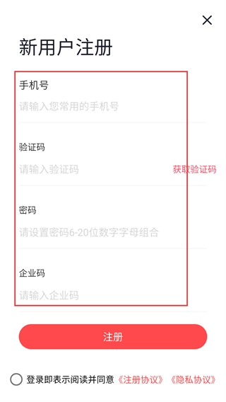 在新用户注册页面,按以下步骤操作:先填写【手机号】,接着点击【获取验证码】并输入收到的【验证码】,然后设置【密码】,再填写【企业码】,最后点击【注册】按钮即可完成注册。