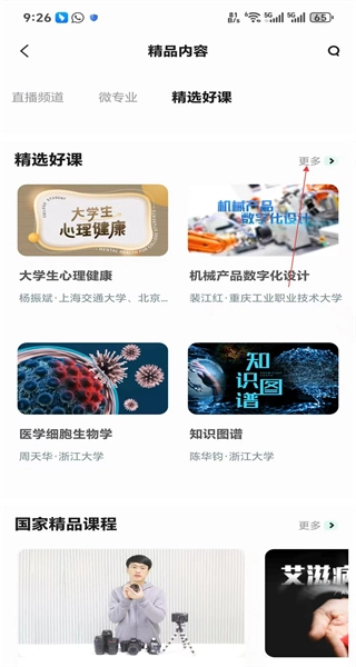 打开软件后,进入精选好课页面,能看到大学生心理健康等课程卡片,接着找到精选好课的更多按钮,准备查看全部课程。