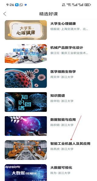 进入精选好课的全部课程页面,浏览展示的多门课程,找到智能工业机器人及其应用课程,准备进入课程详情页。