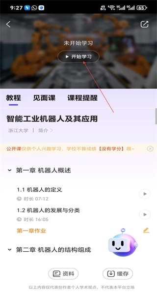 进入智能工业机器人及其应用课程的详情页面,查看课程时长、学习周期等相关信息,找到“加入学习”按钮并点击,完成课程的加入操作。