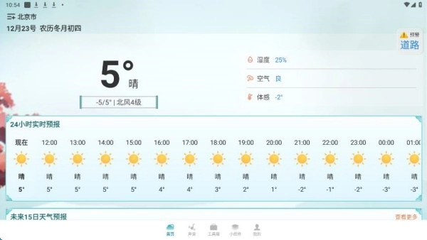 首页展示了本地24小时实时预报数据,可即时查看温度。