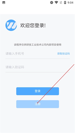 确认该程序仅在研技工业技术公司内部使用后,于对应的输入框中填写手机号码,点击【获取验证码】按钮,输入验证码后执行【登录】操作。