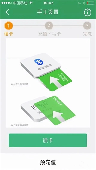 2、若手机不具备NFC功能,可选购移动信联宝盒子或读卡器(请通过正规ETC网点购买)。打开手机中的“高速ETC”应用,同时开启手机蓝牙功能与读卡设备,随后将ETC卡插入或放置于移动信联宝(读卡器)上,在手机端点击“圈存”即可启动写卡操作。