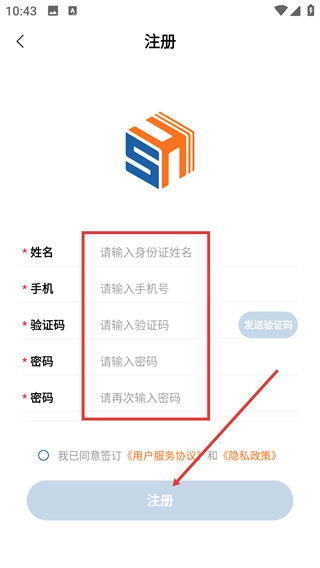进入注册页面后,需要填写姓名、手机号码和验证码,接着设置并确认密码,勾选相关协议后点击【注册】按钮,即可完成账号注册流程。