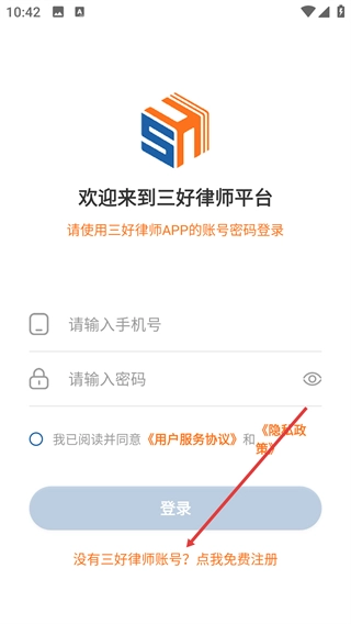 在三好律师平台的登录页面,若没有账号,点击“点我免费注册”按钮即可进入注册流程。