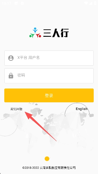 在【三人行】登录界面,要填写X平台的用户名和密码,然后点击【登录】按钮;这个页面上还设置了【常见问题】的入口以及语言切换的选项。