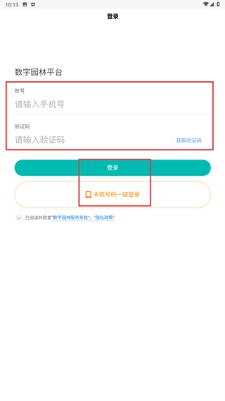在【数字园林平台】的登录页面,输入【手机号】后获取验证码并填入【验证码】栏,随后可通过选择【登录】按钮或【本机号码一键登录】功能来完成登录流程。