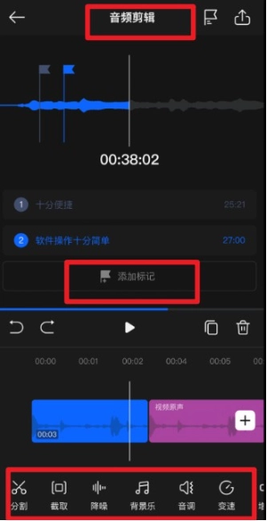 在音频剪辑界面里,能够对录音内容开展“分割、截取、降噪、添加背景乐、调节音调、调整变速”等多种处理操作,并且还支持“添加标记”功能,以此让音频编辑工作变得更加灵活便捷。