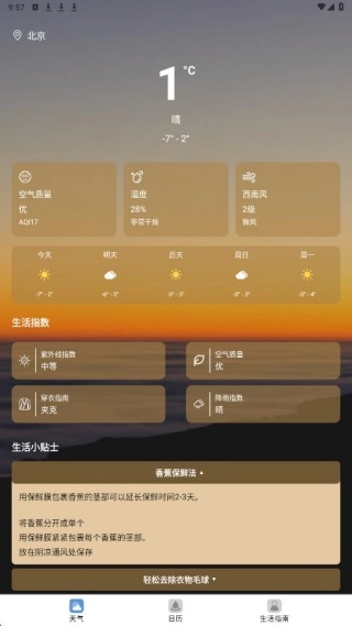 生活小贴士挺实用的,像会告知你今天是否适合洗车,或是提醒你天气干燥时要多补充水分。