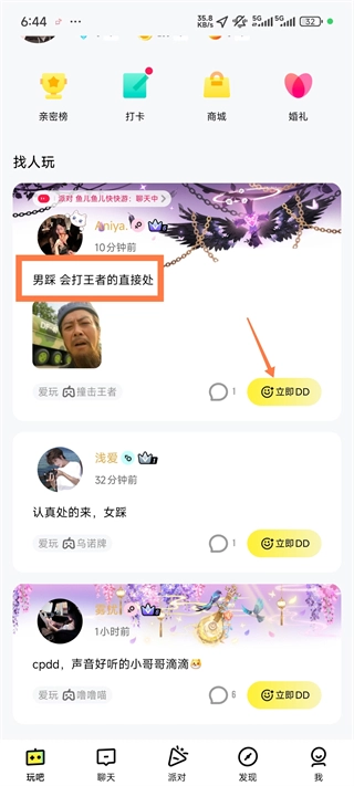 打开软件后,在“玩吧”界面能看到一些想找人一起玩的用户,点击“立即DD”即可。