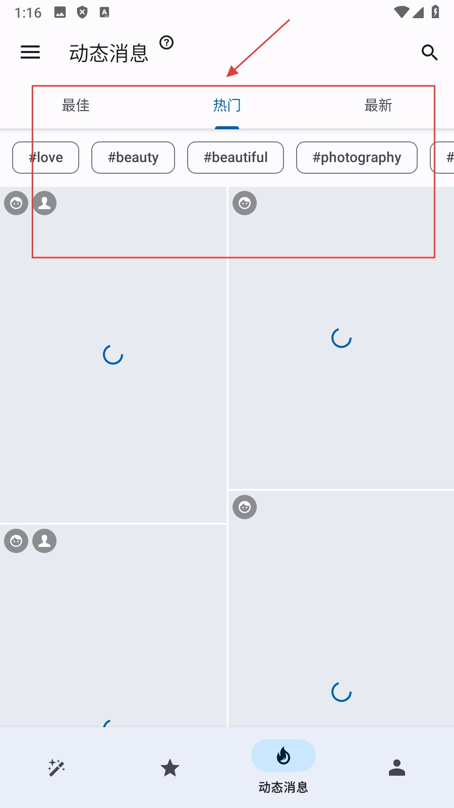 1、进入动态消息界面后,能查看【最佳、热门、最新的动态】,从而知晓热门动态信息。