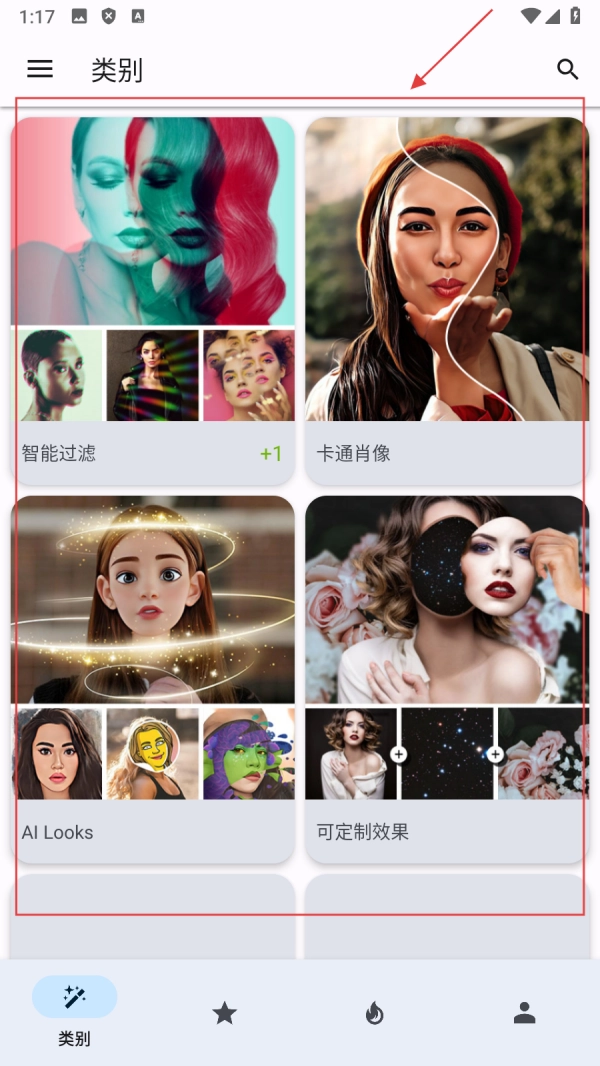 2、进入类别界面后,你可以选择【智能过滤、卡通肖像】等类别,这样能让图像创作体验更好。