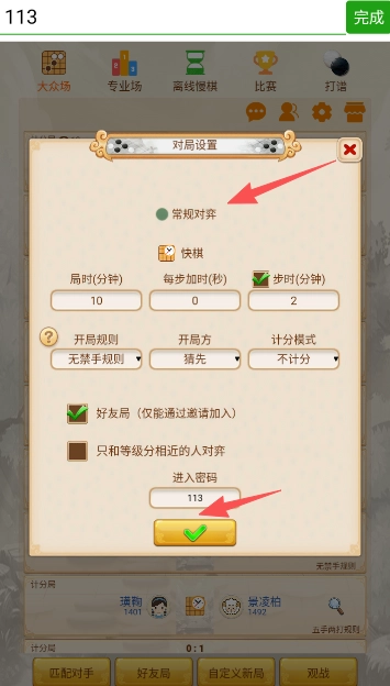 添加好友对战的游戏规则,设置好房间密码,完成上述操作后进行勾选。