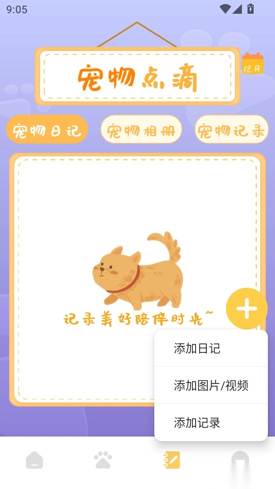 3. 接下来在“宠物点滴”的记录界面,点击“+”按钮,然后选择“添加日记”按钮,进入下一步操作。