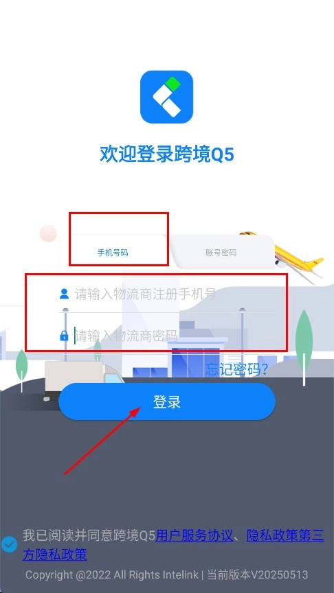 2、选择【手机号码】登录方式,输入物流商注册时使用的手机号和密码,勾选相关协议后点击登录按钮。