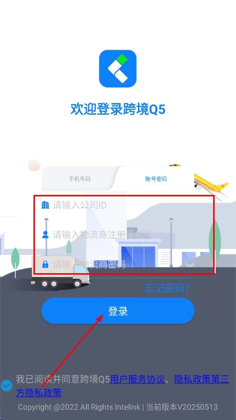 3、选择【账号密码】登录方式,依次输入公司ID、物流商注册手机号及密码,然后点击登录按钮。